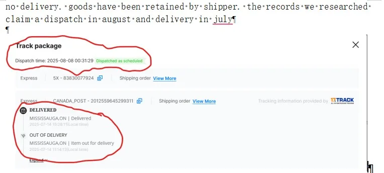 Delivery: no delivery. goods have been retained by shipper. the records we researched claim a dispatch in august and delivery in july